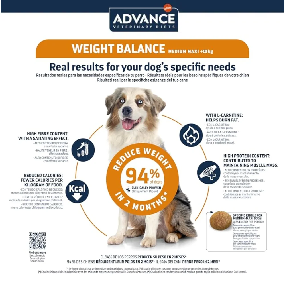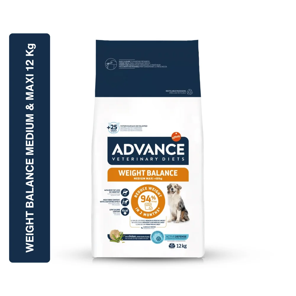 Affinity Advance Weight Balance is a complete veterinary dietary food specifically formulated for Medium and Maxi breed adult dogs requiring weight control and healthy weight management. It is designed to help reduce excess body weight, maintain lean muscle mass, and support overall metabolic health. This formula supports controlled calorie intake while promoting satiety, making it suitable for dogs prone to overweight or obesity. Developed by veterinarians with over 25 years of experience, this specialized diet assists in safe and effective long-term weight management.
