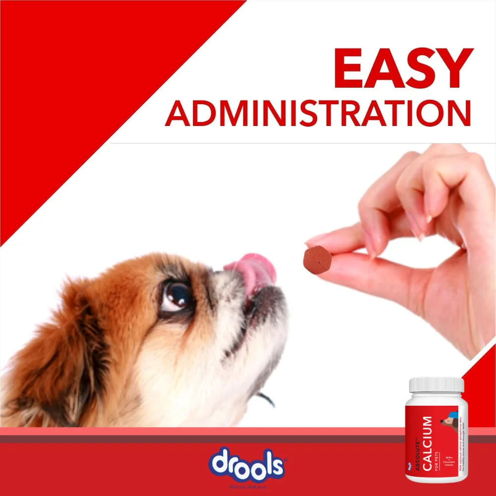 Drools Absolute Calcium Chewable Tablets are an Animal Feed Supplement designed to provide an optimum calcium phosphorus ratio for healthy bones and stronger teeth. The supplement is essential for strong bones and healthy joints (implied from calcium focus) and is suitable for puppies, adult dogs, and pregnant/lactating females. It comes in a chewable tablet format which is easy to administer to dogs. The bottle contains 50 tablets.