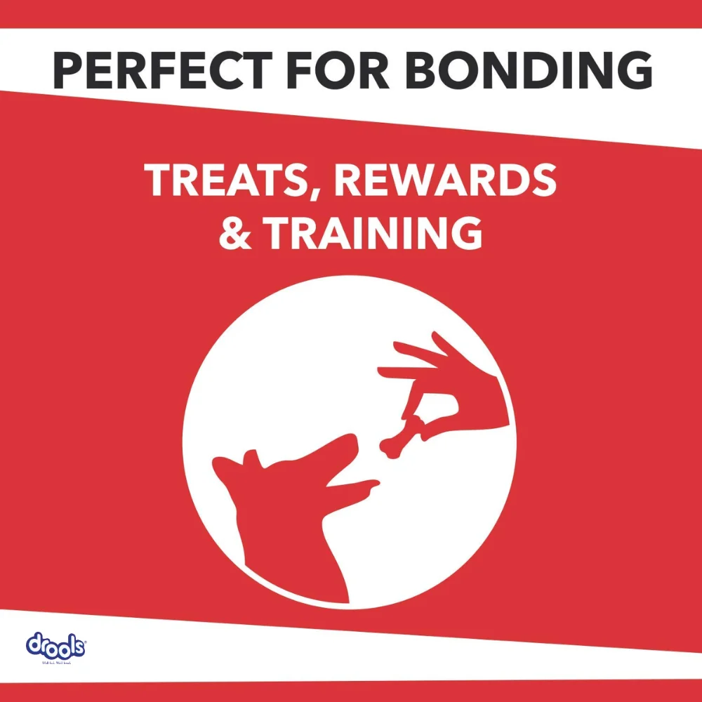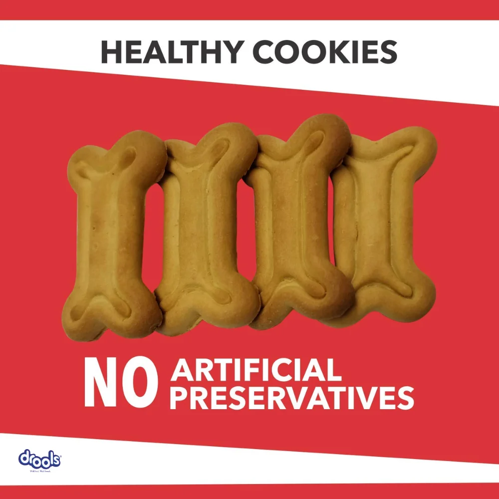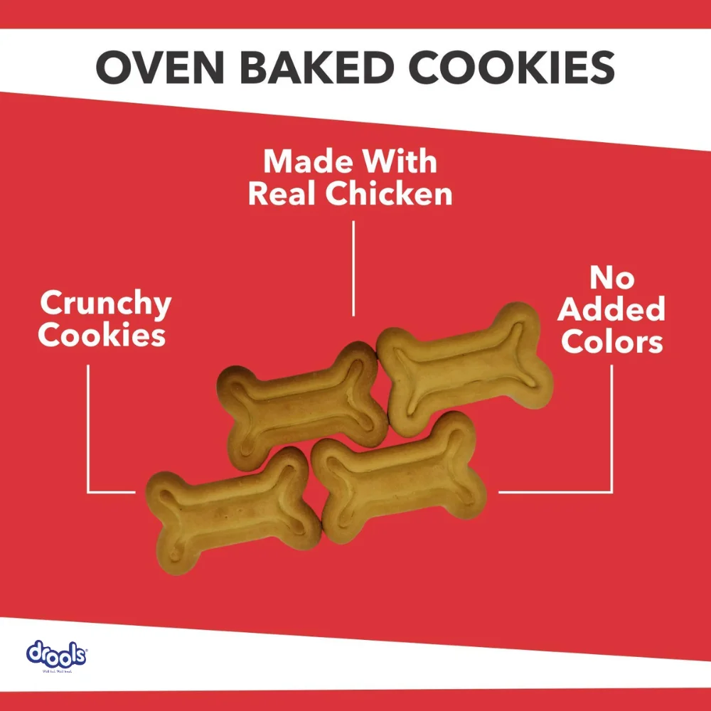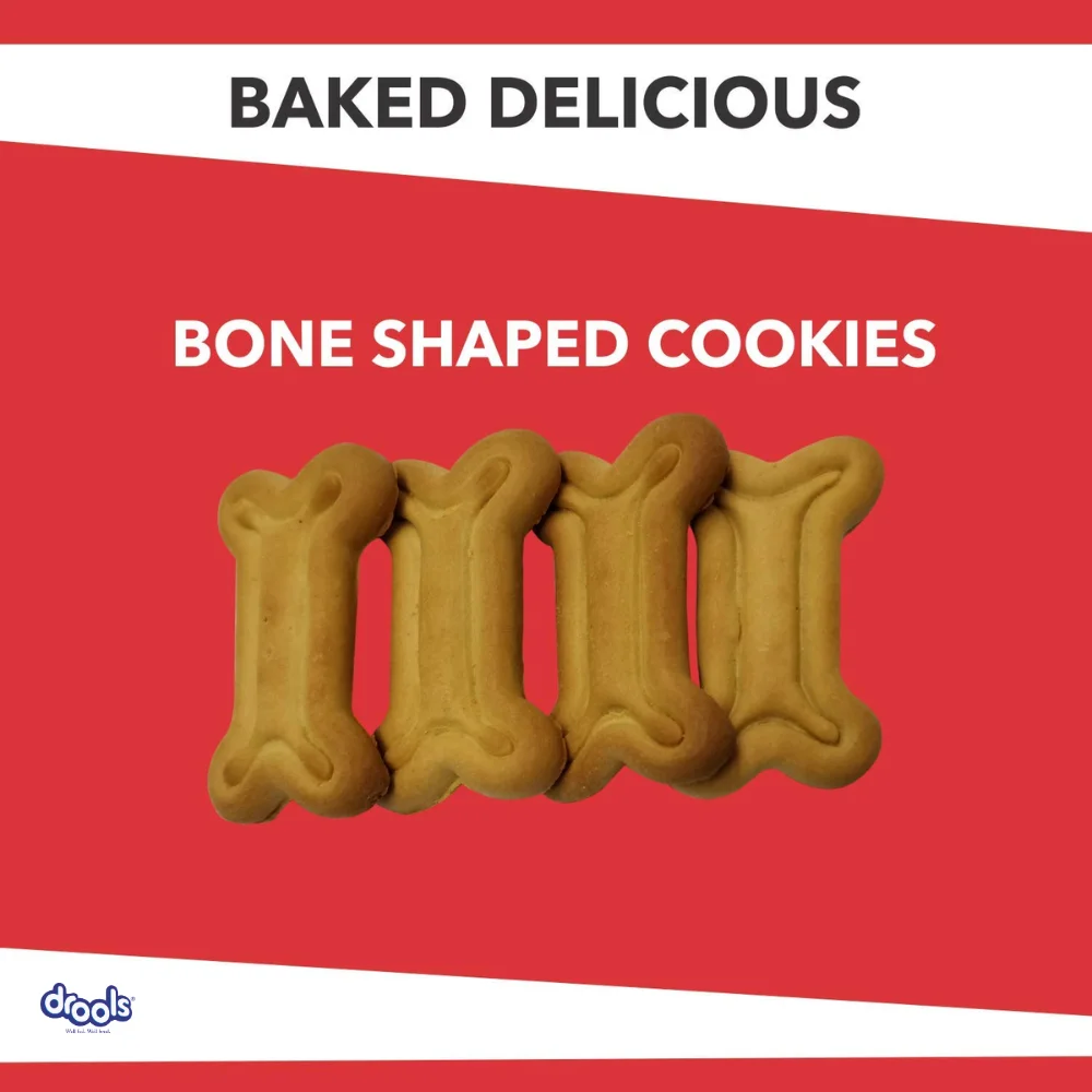 Drools Baked Delights Cookies are crunchy biscuits in a bone shape, suitable for dogs of All Breeds. They are Oven Baked and designed to keep your dog healthy and energetic. The formula is made with 100% Real Chicken, offering an irresistible taste and satisfying crunch. These cookies can be used as a training reward or a treat between meals.