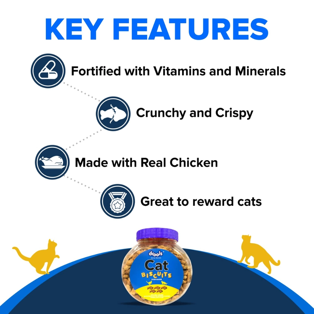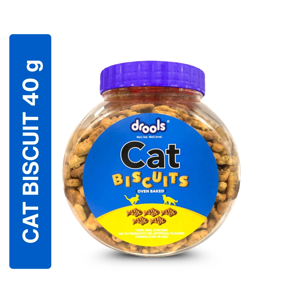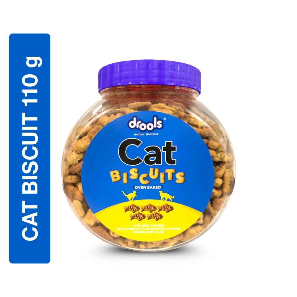 Drools Cat Biscuits are a delectable and crunchy treat suitable for cats of all breeds and sizes. They are Oven Baked to provide a unique texture and irresistible taste. The formula is made with 100% Real Chicken and is promoted as containing No By-Products, No Artificial Colours, and No Artificial Flavors. These biscuits can be used as a training reward or a savory snack between meals. The crunchy texture helps to reduce plaque and tartar build-up, supporting Dental Health. The formula is fortified with essential nutrients to support the cat’s vitality and overall well-being.