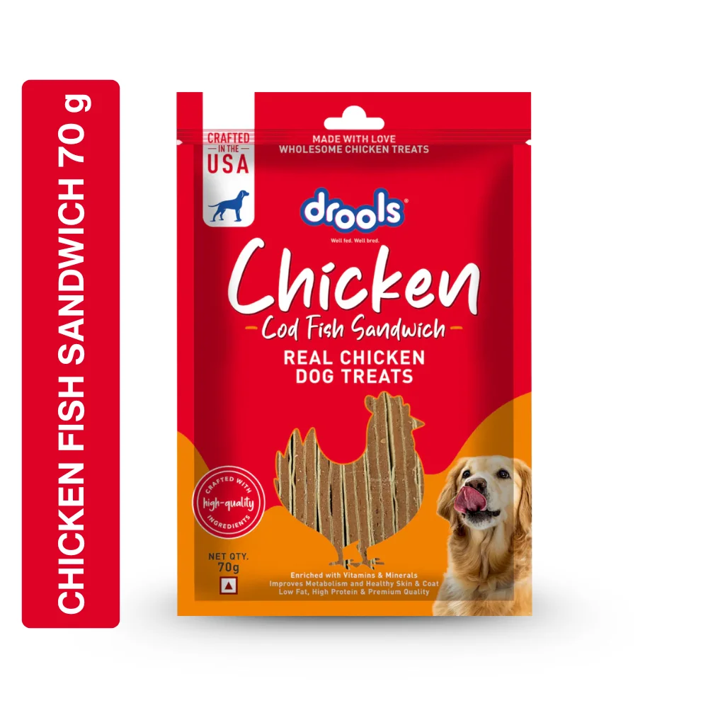 Drools Chicken Cod Fish Sandwich are savory, soft, and chewable treats in a sandwich format, designed for dogs of all breeds and sizes. They are crafted with Real Chicken and Cod Fish and are marketed as being made with love and wholesome chicken treats. These treats are promoted as being Low Fat while maintaining a High Protein content and are of Premium Quality. The formula is enriched with vitamins and minerals. They are suitable for feeding as a reward during training sessions or as a snack between meals. They are formulated and crafted in the USA with high-quality ingredients.