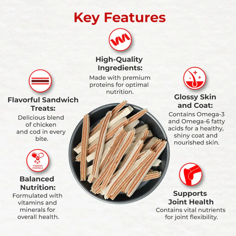 This treat is enriched with Vitamins and Minerals to improve metabolism and support Healthy Skin & Coat. It provides a Low Fat and High Protein snack.