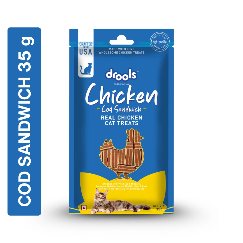 Drools Chicken Cod Sandwich Cat Treats are savory, soft, and chewable stick treats designed for cats of all breeds and sizes. They are crafted with Real Chicken and Cod, offering an irresistible sandwich format. These treats are promoted as being Low Fat while maintaining a High Protein content and are of Premium Quality. The formula contains added vitamins and minerals to improve the cat’s metabolism and promote Healthy Skin and Coat. They are suitable for feeding as a reward during training sessions or as a snack between meals. They are formulated and crafted in the USA with high-quality ingredients.