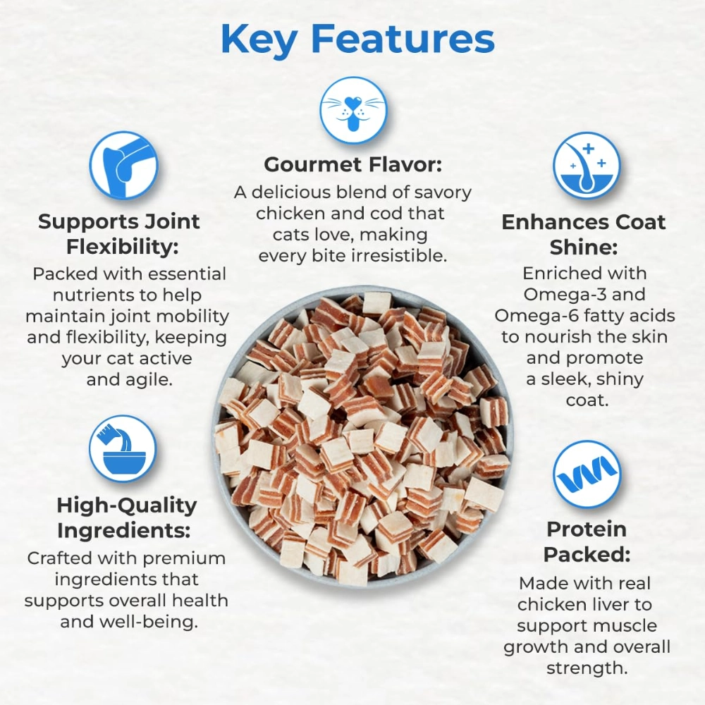 This treat is fortified with Vitamins and Minerals to improve metabolism. It is low fat and high protein. Taurine is included as an essential amino acid to support healthy eyesight and heart function. Omega Fatty Acids (from cod and chicken) support Healthy Skin and Coat.