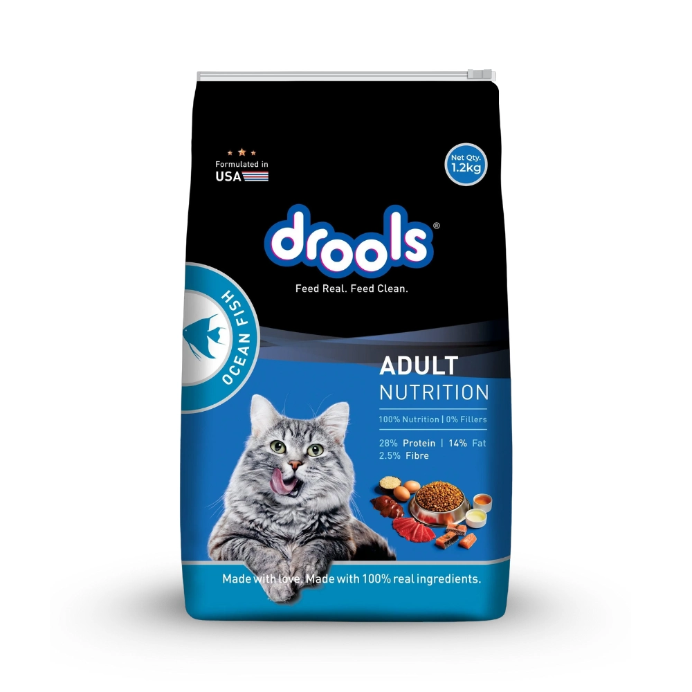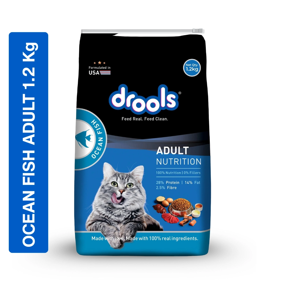 Drools Adult Nutrition Ocean Fish Dry Cat Food is a complete and balanced meal for adult cats. It is made with 100% Real Ingredients and contains 0% Fillers, emphasizing its quality. The formula provides 100% Nutrition and is fortified with essential vitamins, minerals, and amino acids to maintain the overall health of the cat. It is formulated in the USA. This food promotes healthy digestion, a shiny coat, strong bones, and healthy eyesight.
