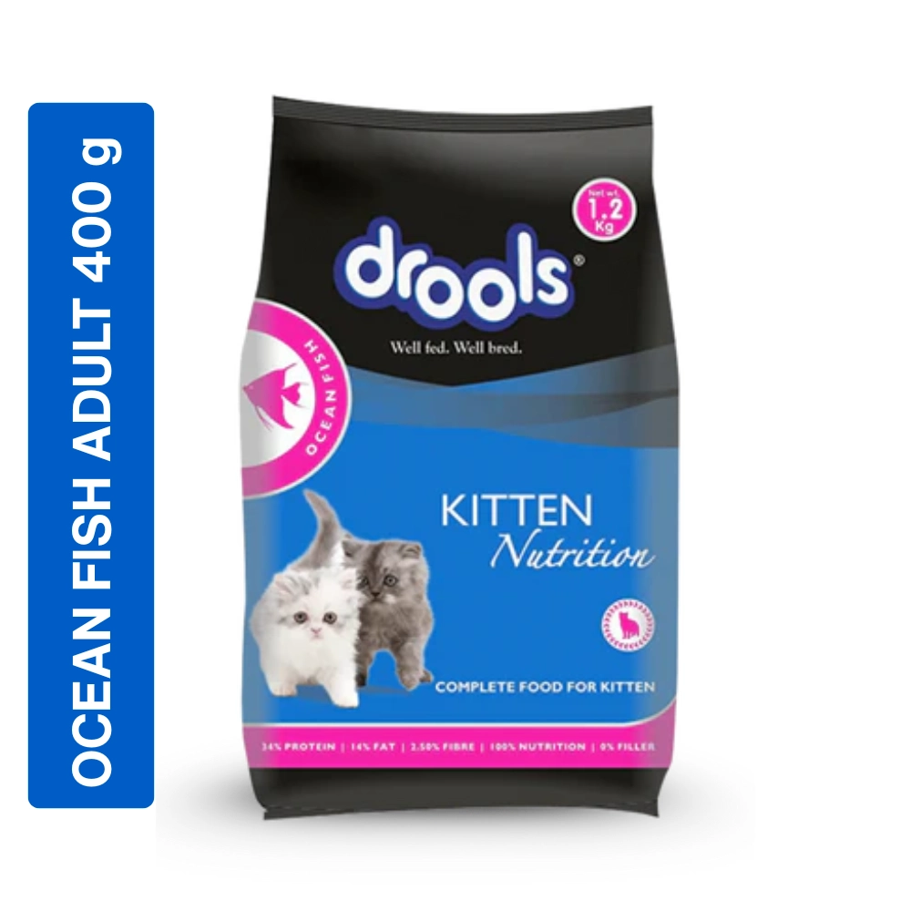 Drools Kitten Nutrition Ocean Fish Dry Cat Food is a complete and balanced meal specifically formulated for growing kittens. It is made with 100% Real Ingredients and contains 0% Fillers, emphasizing its quality. The food provides 100% Nutrition and is fortified with essential vitamins, minerals, and amino acids to maintain the overall health and support the rapid growth of the kitten. This formula is tailored to promote healthy digestion, a shiny coat, strong bones, and healthy eyesight.