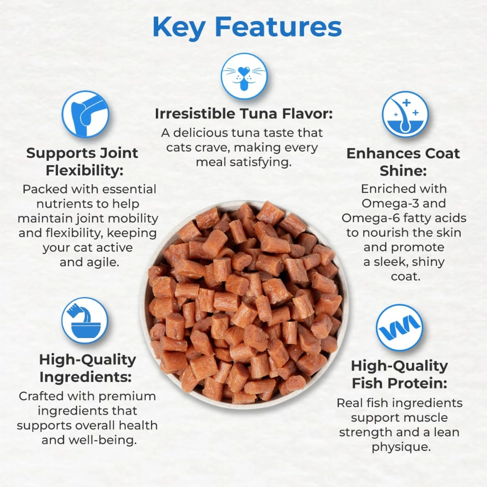 This treat is fortified with Vitamins and Minerals to improve metabolism. It is low fat and high protein. Taurine is included as an essential amino acid to support healthy eyesight and heart function. Omega Fatty Acids (from fish) support Healthy Skin and Coat.