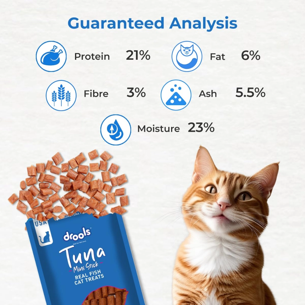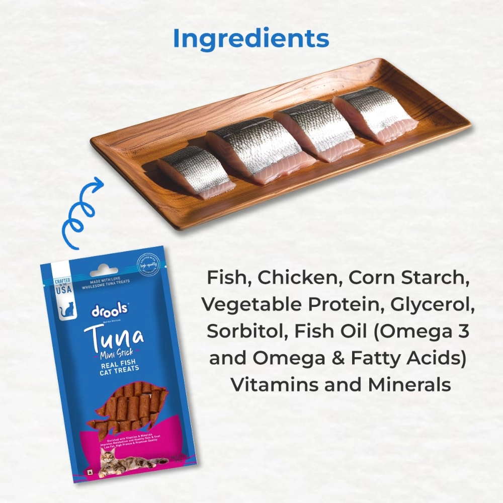 Drools Tuna Mini Stick Real Fish Cat Treats are delectable, soft, and chewable stick treats designed for cats of all breeds and sizes. They are crafted with Real Fish (Tuna) and High-Quality Ingredients. These treats are promoted as being Low Fat while maintaining a High Protein content and are of Premium Quality. The formula contains added vitamins and minerals to improve the cat’s metabolism and promote Healthy Skin and Coat. They are suitable for feeding as a reward during training sessions or as a snack between meals. The treats are crafted in the USA.