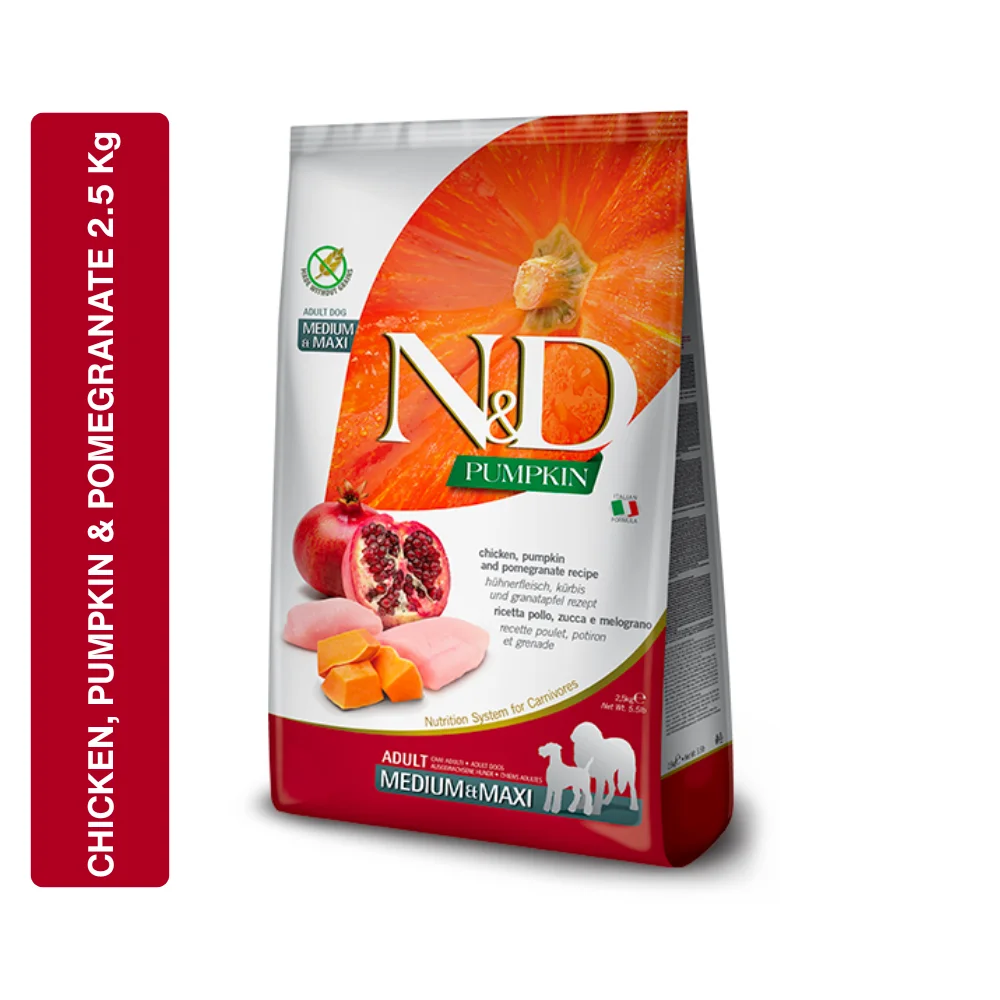 Farmina N&D Pumpkin is a complete food for adult dogs that is specifically formulated for Medium & Maxi breeds. This formula is a Nutrition System for Carnivores that uses the unique properties of pumpkin. It is made with fresh deboned chicken and is a Grain-Free formula (implied by N&D Pumpkin line). It provides a naturally nutritious diet for adult dogs.