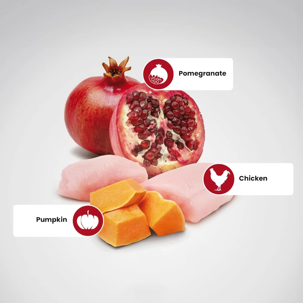 Pumpkin is included for its unique properties and nutritional benefits. Pomegranate provides natural antioxidants. The formula is rich in high-quality protein to support lean muscle mass.