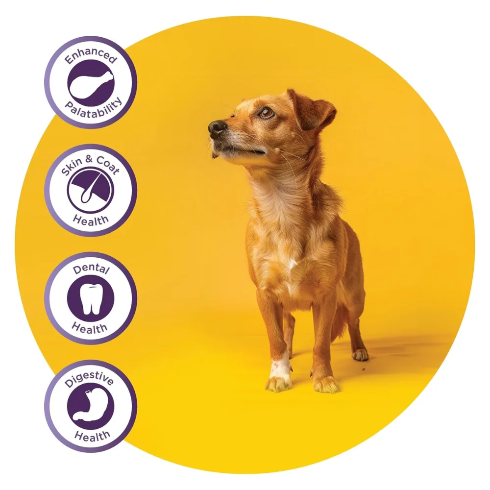 (Specific nutritional additives are not fully visible on the packaging information). The formula is enriched with essential vitamins, minerals, and functional nutrients that support immune health, digestive function, and healthy skin and coat in small and medium breed dogs.