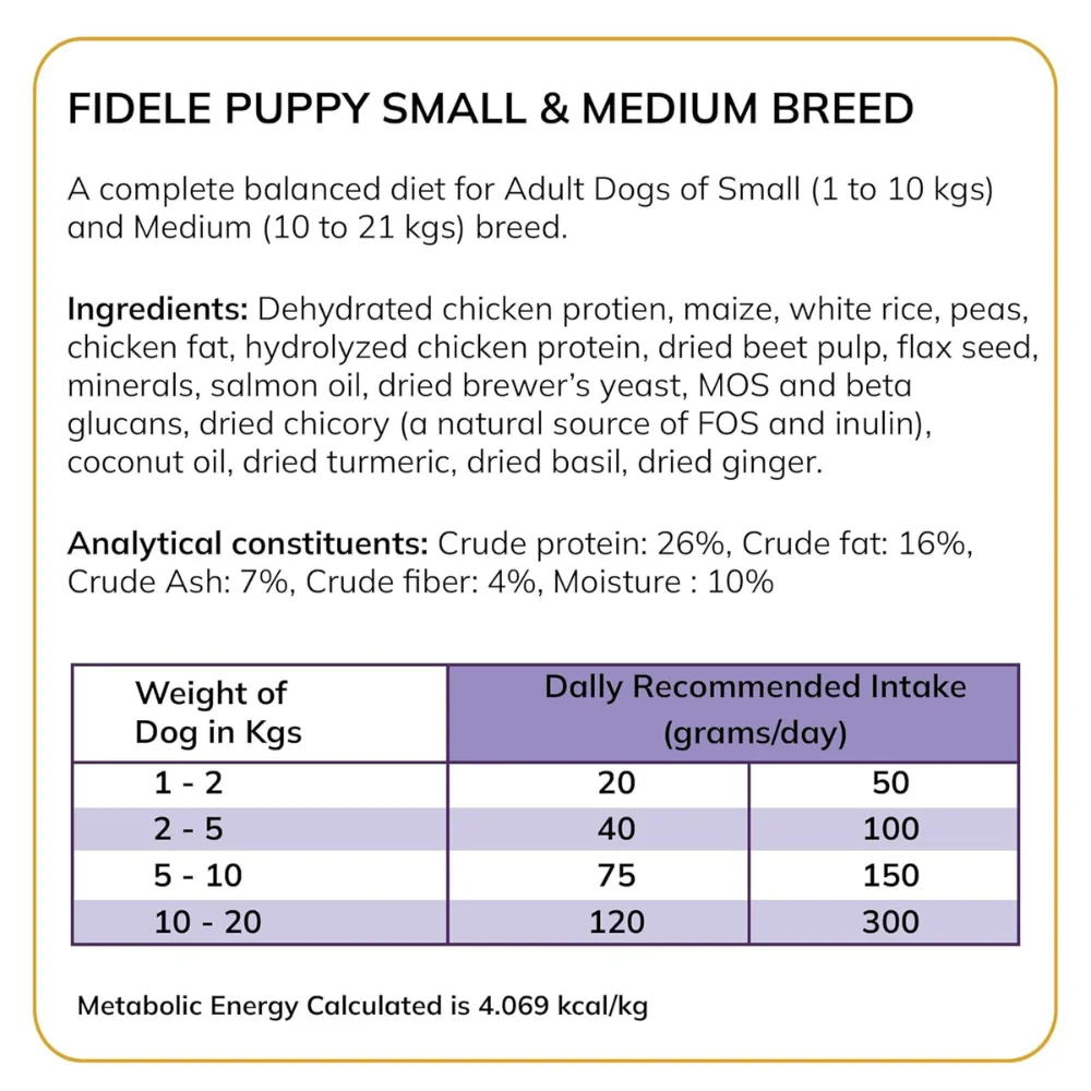 Fidele+ Dry Dog Food Adult Small & Medium Breed is a complete and balanced pet food specially formulated to meet the nutritional needs of adult small and medium breed dogs. It is designed to support optimal body condition, maintain lean muscle mass, and promote overall vitality. This formula caters to the specific energy and digestive requirements of small and medium breed dogs, helping support healthy digestion, strong immunity, and everyday wellbeing.