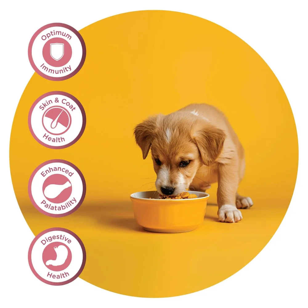 (Specific nutritional additives are not fully visible on the packaging information). The formula is enriched with essential vitamins, minerals, and functional nutrients that support immune system development, bone strength, and overall healthy growth in small and medium breed puppies.
