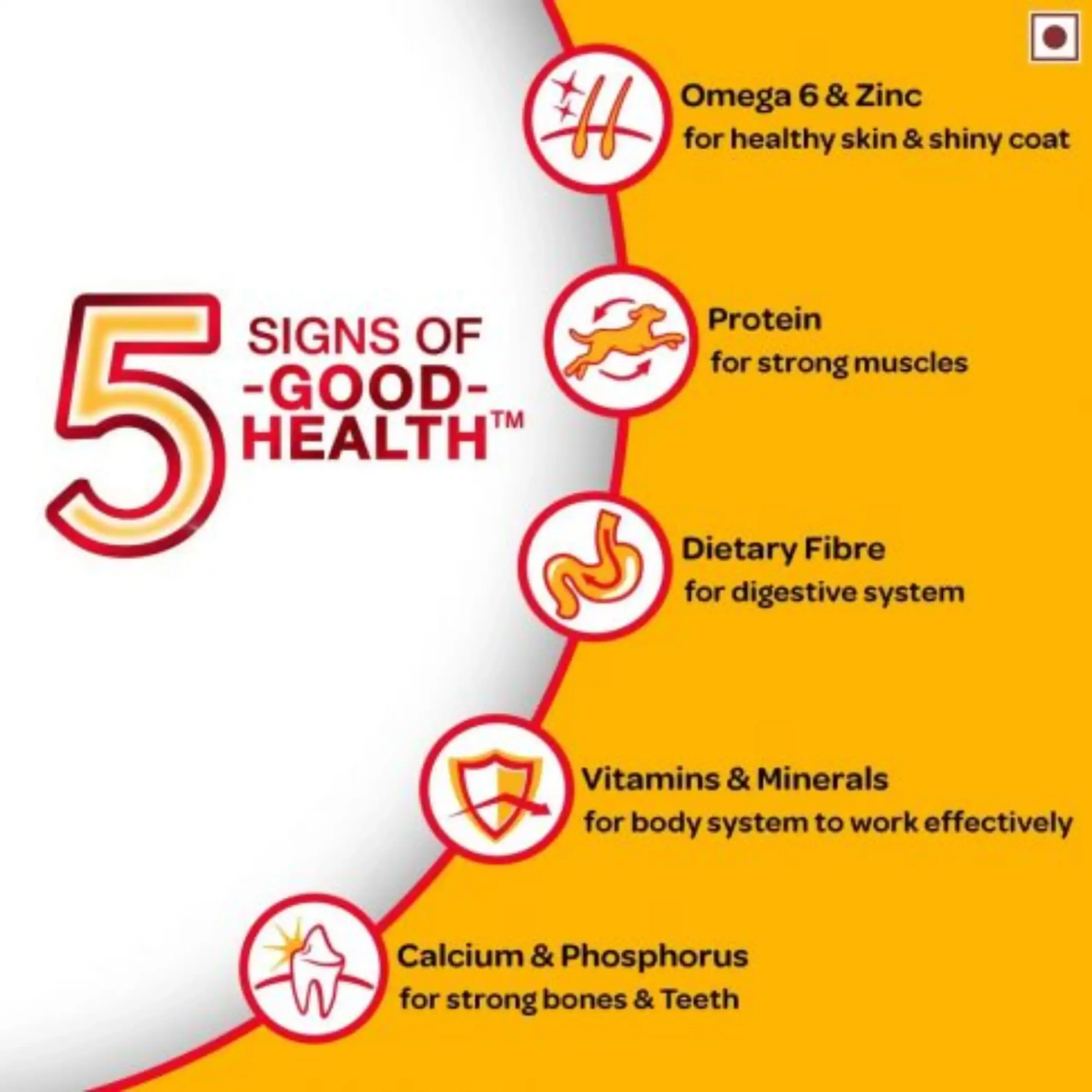 This food is rich in essential nutrients. Protein and Calcium support the development of strong muscles and bones. DHA supports brain and vision development. Vitamin E and Selenium help in building a strong natural defence system. A special blend of Linoleic Acid (Omega 6) and Zinc promotes soft and shiny skin and coat. The food is formulated based on research from the Waltham Centre for Pet Nutrition.