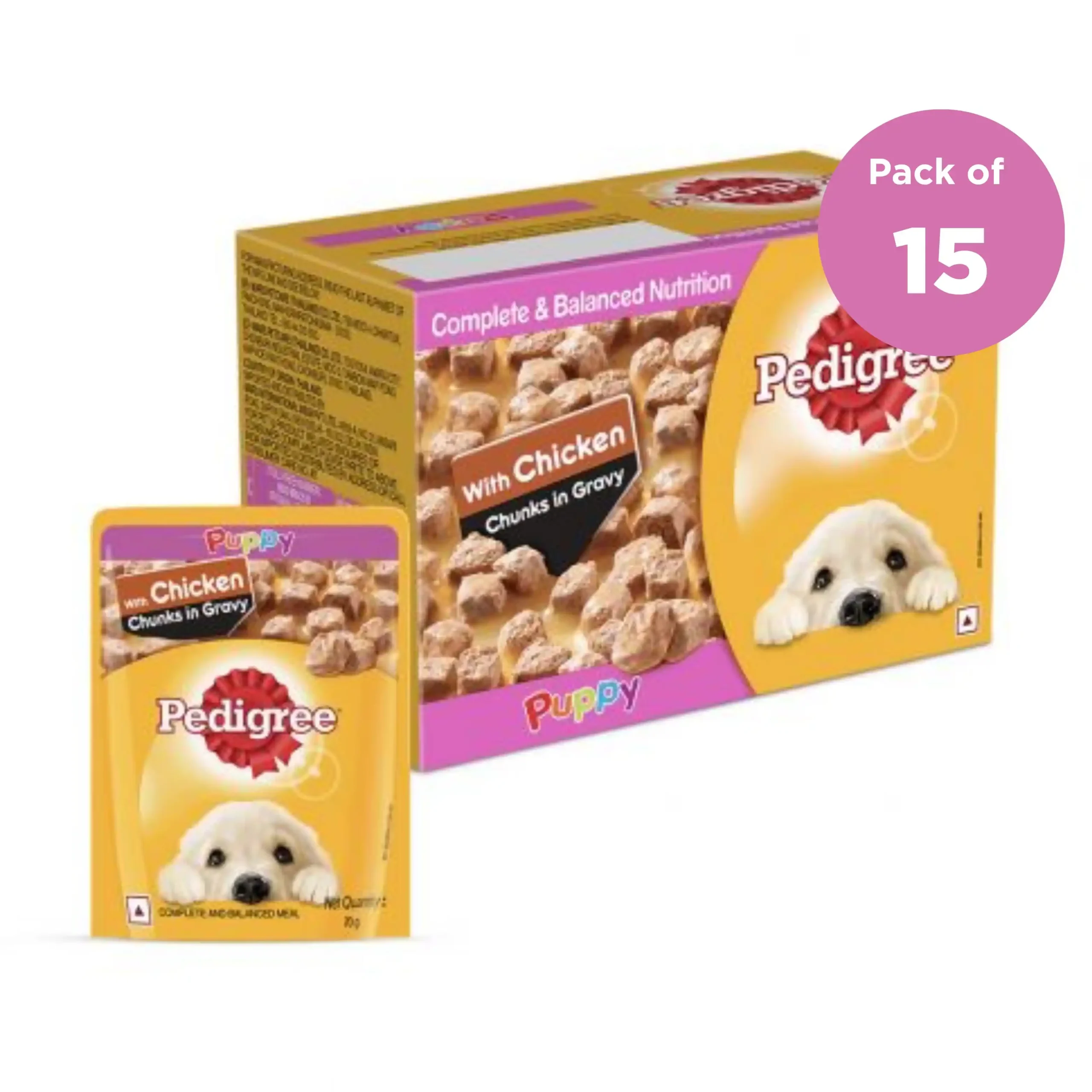 Pedigree Puppy Wet Dog Food with Chicken Chunks in Gravy is a 100% complete and balanced meal for puppies. It is easy to feed and consists of moist chicken chunks gently cooked in a healthy gravy, which helps retain vitamins and increases the overall water content, aiding in hydration, especially during hot seasons. This food helps to reduce the risk of stones. The formula is made with high-quality ingredients and provides the 5 Signs of Good Health: healthy skin and coat, strong bones and teeth, a healthy digestive system, strong muscles, and a strong immune system. The tempting aroma and flavour make it effective in attracting fussy eaters. It can be mixed with Pedigree dry food or home-cooked food.