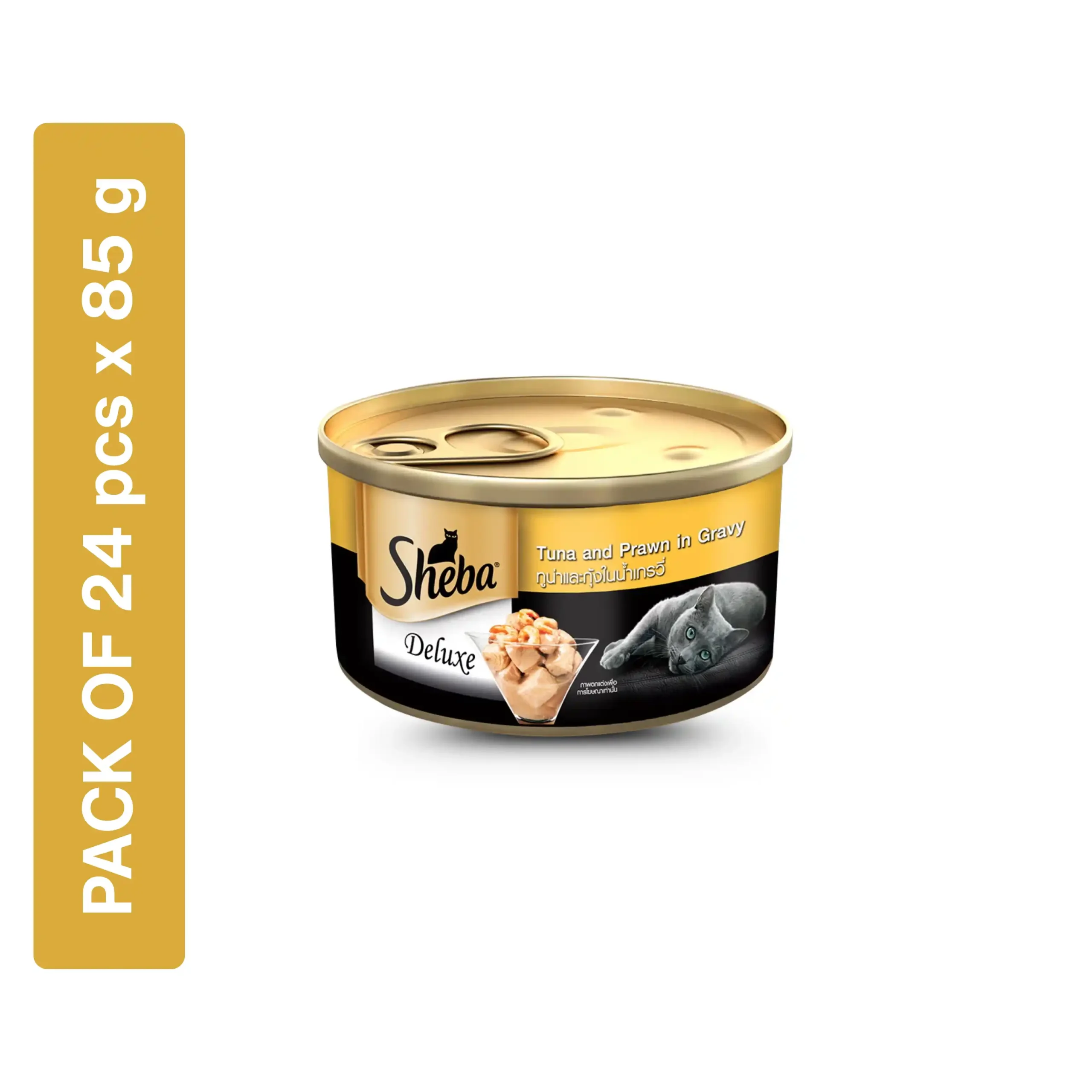 Sheba Deluxe Tuna Fillet & Whole Prawns in Gravy is a premium wet cat food designed for adult cats aged 1 year and older. It is typically a Complementary Food, recommended to be served alongside a complete and balanced diet (like Whiskas Adult Dry Food) to meet the cat’s full nutritional needs. This gourmet recipe features tender fillets of real tuna and whole prawns in a rich, savory gravy. The high-quality meal is protein-rich and highly palatable, with a tantalizing texture that satisfies even the most discerning feline. The high moisture content (maximum 90%) ensures the cat stays well-hydrated, supporting urinary tract health. It is crafted with responsibly sourced seafood and is often described as being made without grains or corn.