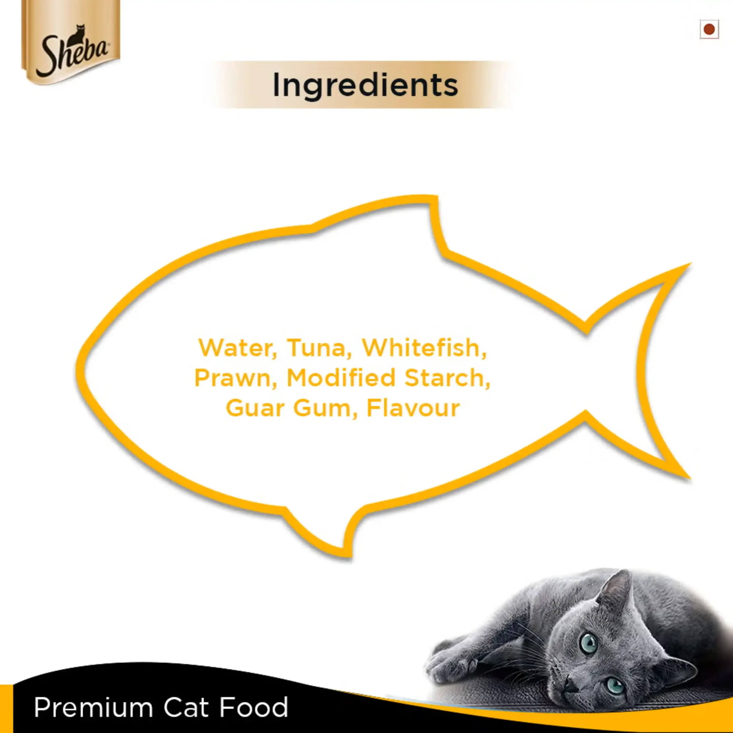 Water, Tuna, Whitefish, Prawn, Thickening Agents (e.g., modified starch, guar gum), Flavor.