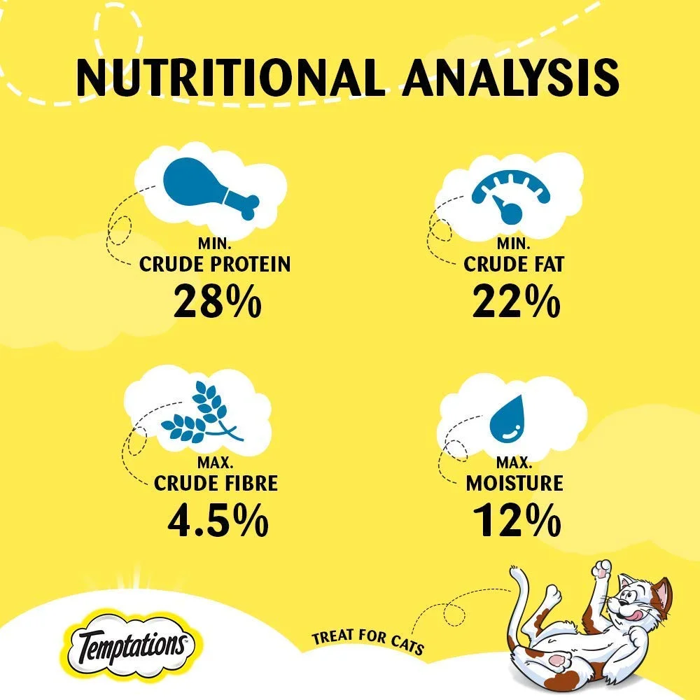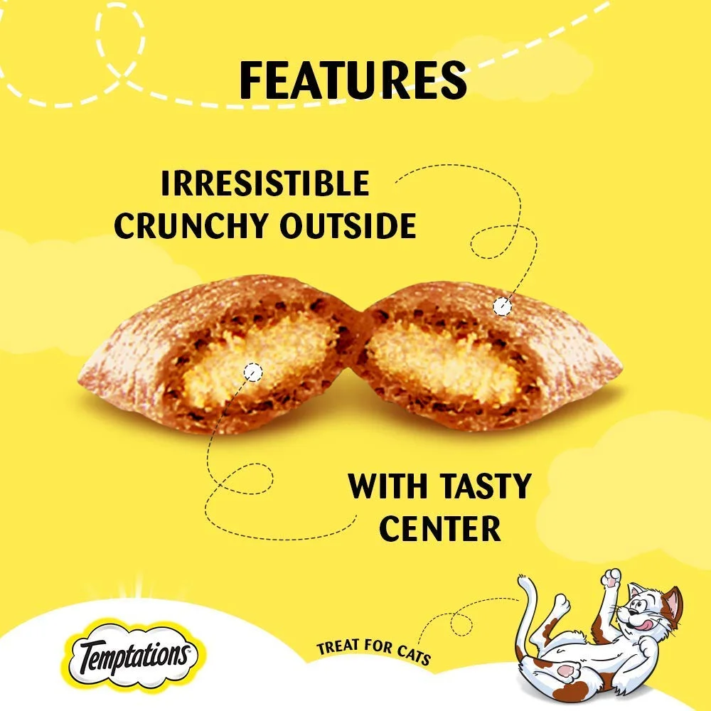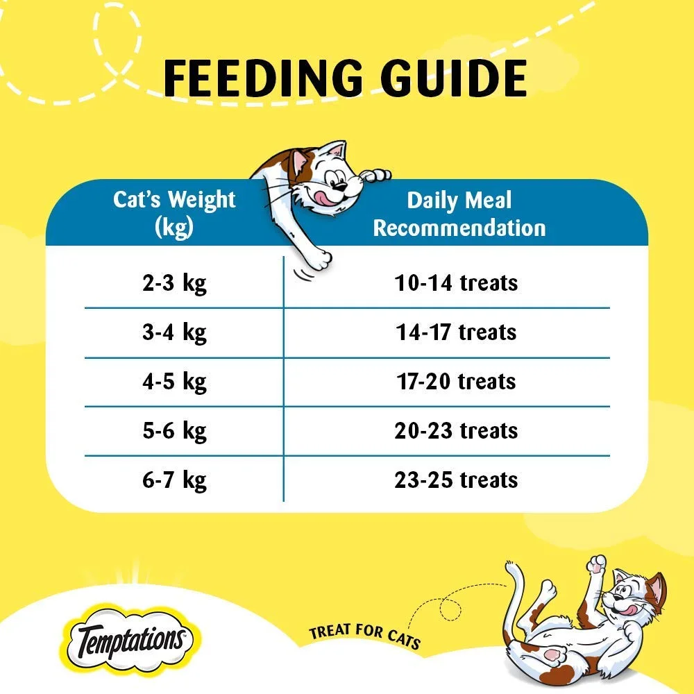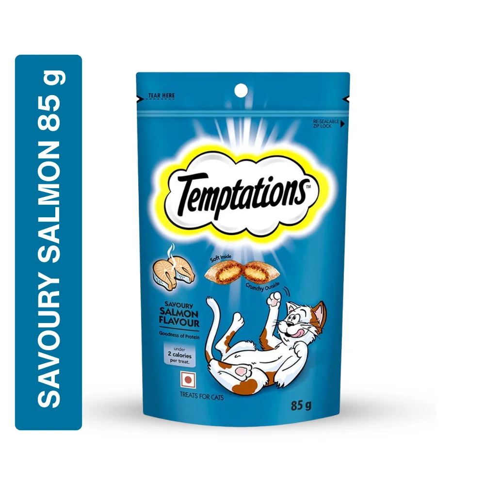 Temptations Cat Treat Savoury Salmon Flavour is a tasty, crunchy, and soft cat treat designed for adult cats of all breeds. These treats provide a fun way to reward your cat while supporting healthy eating habits. Formulated with real salmon flavor, they are irresistible to cats and help promote playful behavior. Temptations treats are veterinarian-approved, safe for regular use, and make snack time enjoyable without overfeeding.