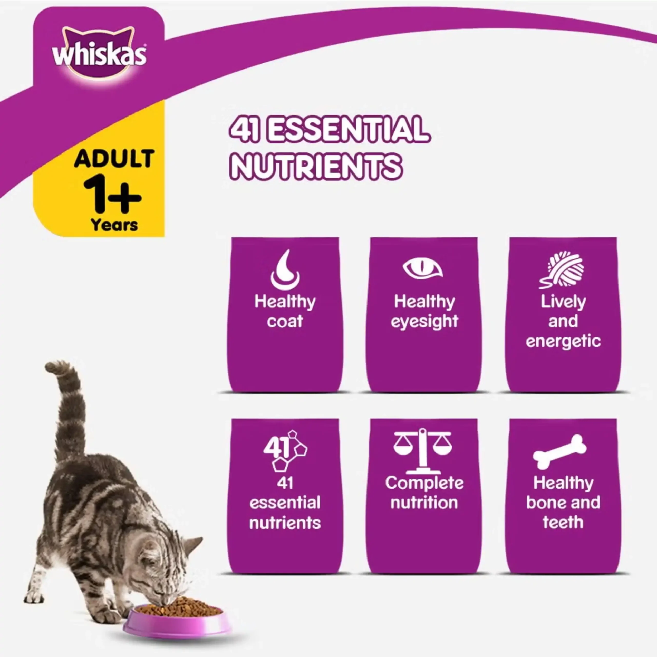 WHISKAS® Adult Dry Cat Food, Chicken Flavour, is a 100% complete and nutritionally balanced meal specifically formulated to cater to the requirements of an adult cat’s system (1 year and older). It contains 41 essential nutrients and a special blend of 23 vitamins and minerals to keep the cat lively and energetic. The food is developed by vets and scientists at the WALTHAM™ Petcare Science Institute. It comes in flavorful crunchy chunks that appeal to the cat’s palate and is fortified with Prebiotics to support digestive health and microflora balance. The kibbles are often described as tasty filled pockets.
