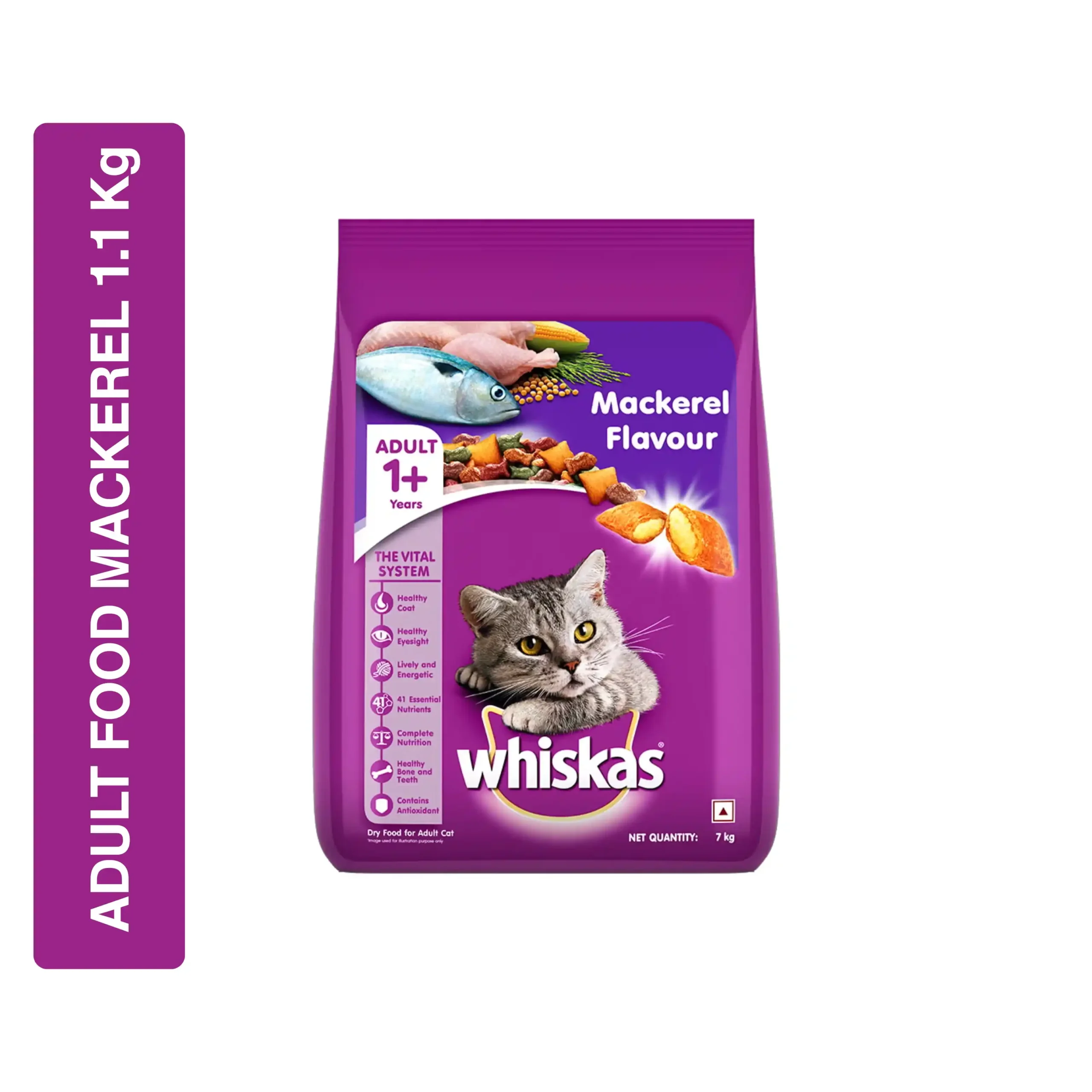 WHISKAS® Adult Dry Cat Food, Mackerel Flavour, is a 100% complete and nutritionally balanced meal specifically formulated for adult cats (1 year and older). It contains real mackerel and poultry ingredients, providing high-quality protein to strengthen the cat’s muscles. This formula contains 41 essential nutrients and a special blend of 26-32 vitamins and minerals (depending on specific packaging) to support the cat’s vital system, keeping them lively and energetic. It is developed by vets and scientists at the WALTHAM™ Petcare Science Institute. The delicious, crunchy chunks with a tasty flavour encourage consumption.