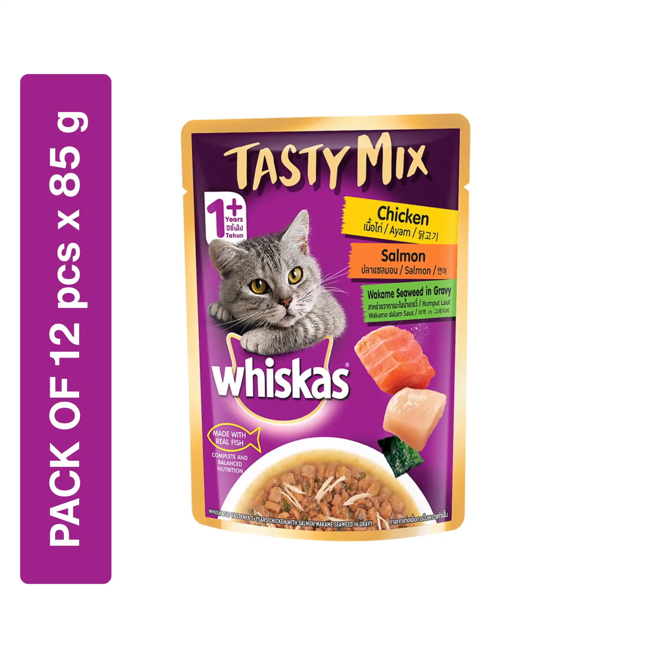 WHISKAS® Tasty Mix Chicken, Salmon & Wakame Seaweed in Gravy is a complete and balanced wet cat food recipe that provides 100% of an adult cat’s daily nutritional needs (1 year and older). It is a new, delightful blend made with real fish and fresh chicken meat, combined with nutritious Wakame seaweed in a delectable gravy sauce. This appetizing texture, aroma, and flavour appeals to the feline palate and attracts even fussy eaters. The gravy format and high moisture content aids in hydration and provides nourishment. It is thoughtfully blended with more than 40 essential nutritional elements.